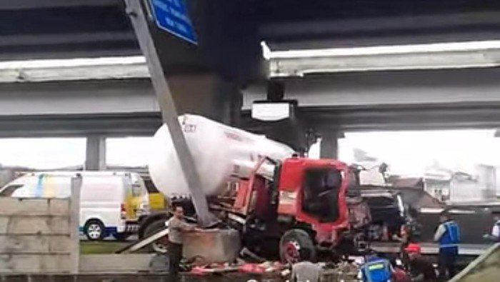 Dari video yang beredar, truk tangki tersebut menghantam tembok pembatas jalan hingga hancur.