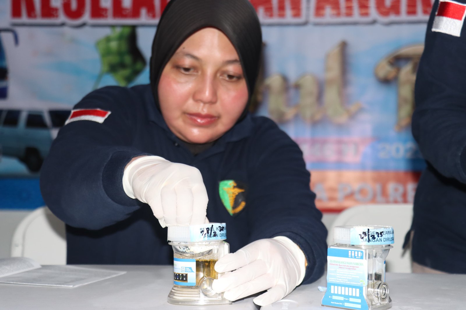 Kemudian, mereka pun tes urine di tempat yang telah disediakan. Sembari menunggu hasil tes keluar, sejumlah petugas juga terlihat mengecek kesehatan para sopir.