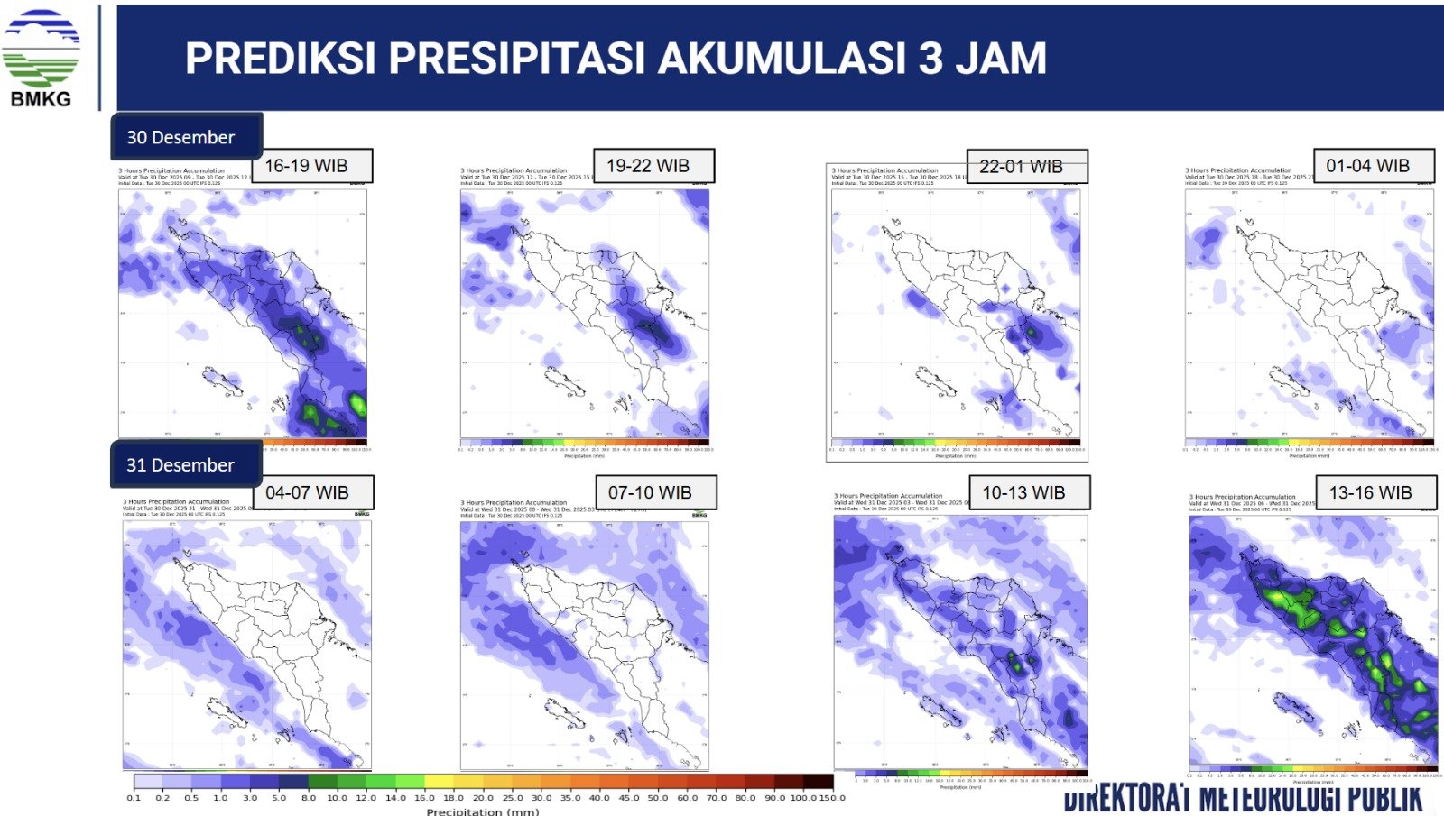 Juru Bicara Posko Penanganan Banjir dan Longsor Aceh, Murthalamuddin, mengatakan prakiraan tersebut data dari update prediksi presipitasi per tiga jam BMKG Stasiun Meteorologi Kelas I Sultan Iskandar Muda Banda Aceh untuk periode 30-31 Desember 2025.