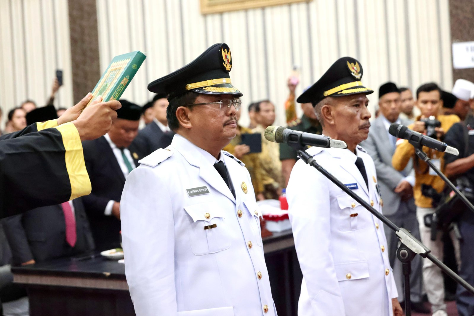 Gubernur Aceh Muzakir Manaf, mengambil sumpah jabatan dan melantik H. Safriadi Oyon, S.H sebagai Bupati Aceh Singkil, H. hamzah Sulaiman, S.H sebagai Wakil Bupati Aceh Singkil periode 2025-2030, pada Rapat Paripurna DPRK Aceh Singkil , di Gedung DPRK Aceh Singkil, Sabtu, 14/2/2025.