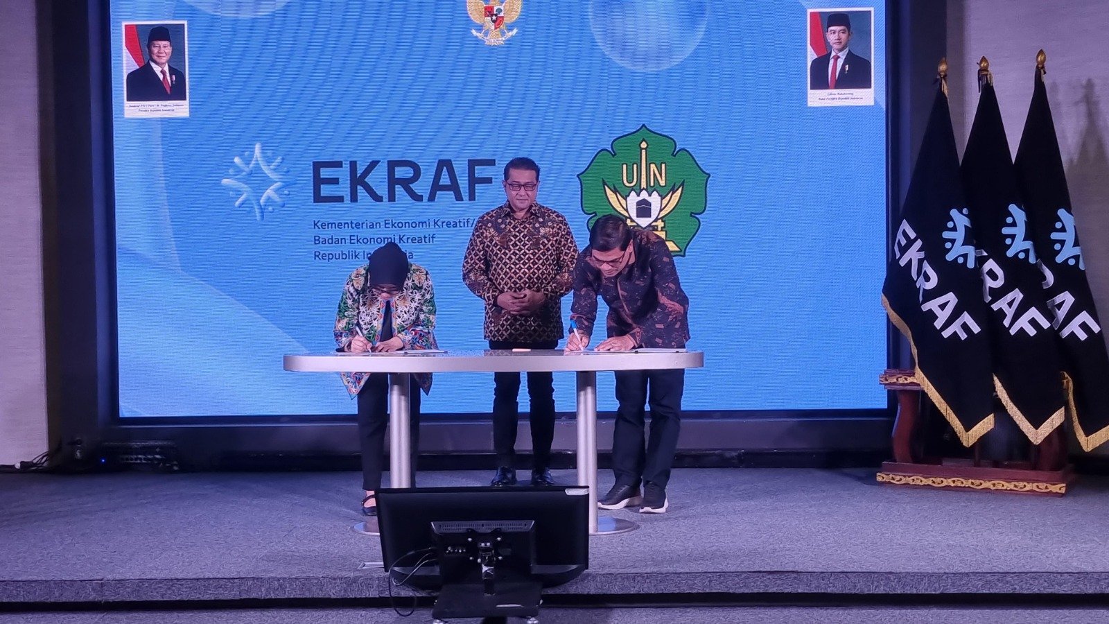 Menteri Ekonomi Kreatif/Kepala Badan Ekonomi Kreatif (Menekraf/Kabekraf) Teuku Riefky Harsya turut hadir dan menyaksikan langsung prosesi penandatanganan, bersama sejumlah pimpinan perguruan tinggi lainnya.